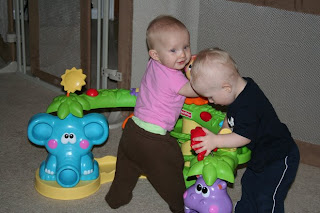 The doctor said that Ava is right on track developmentally for a 1 year old, while Drew is a little ahead of the curve(b/c he's walking). It was a very good visit--except for the shots, but the video in the car seemed to make it all better! :)